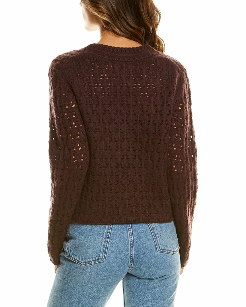 - Crochet Wool & Cashmere-Blend Cardigan in plum wine with crochet knit and V-neck