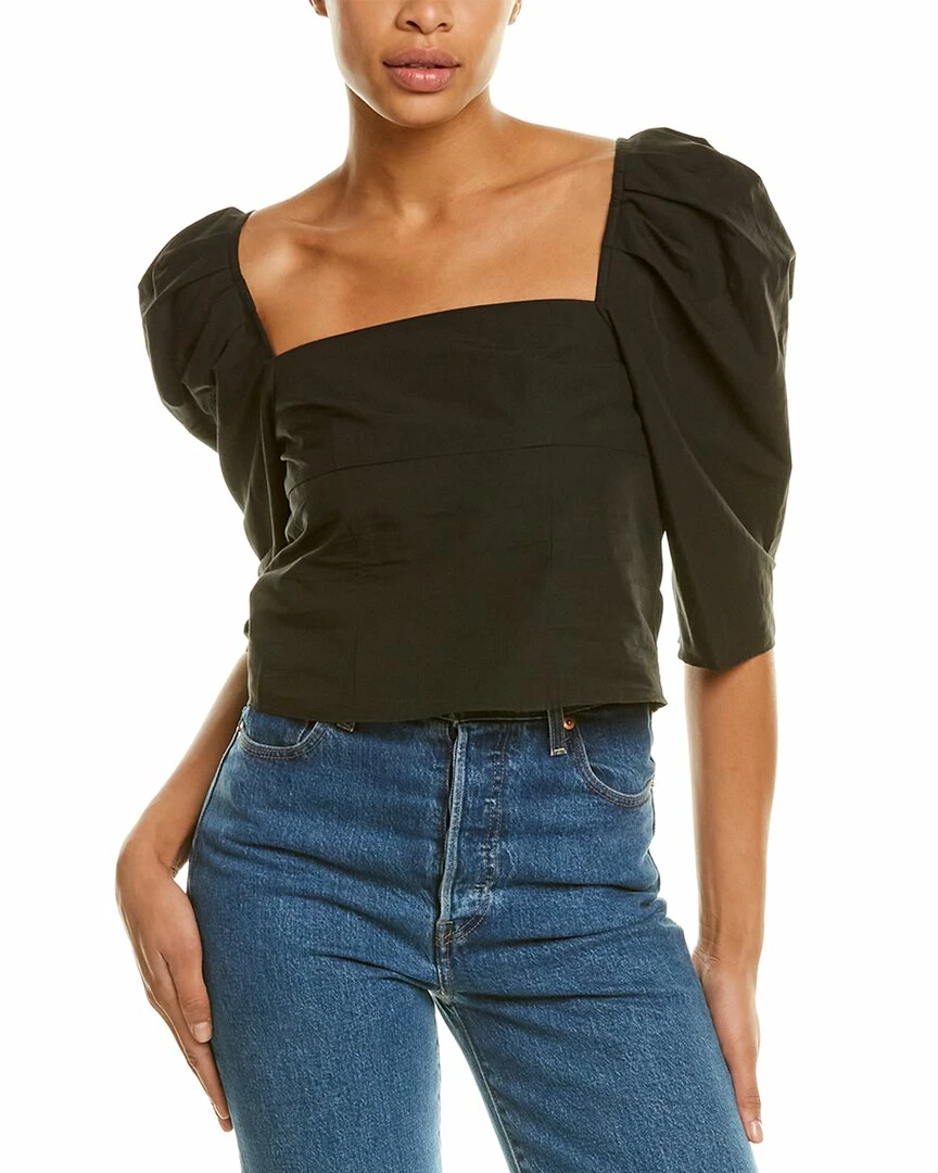 - Draped Square Neck Top in black with pleated shoulder elbow-length sleeves