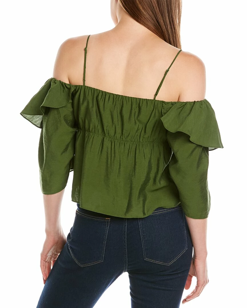 - Off-The-Shoulder Cami in herb with adjustable shoulder straps, elasticized neckline, and ruffle shoulders