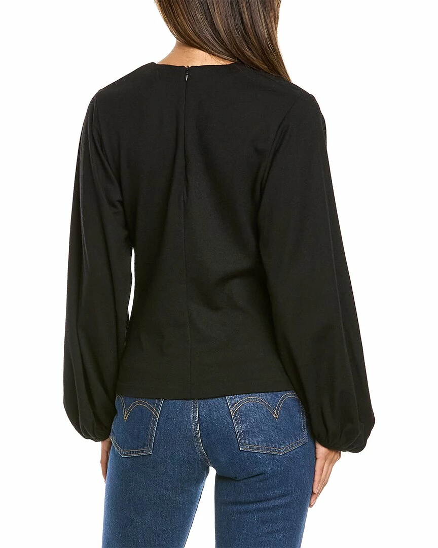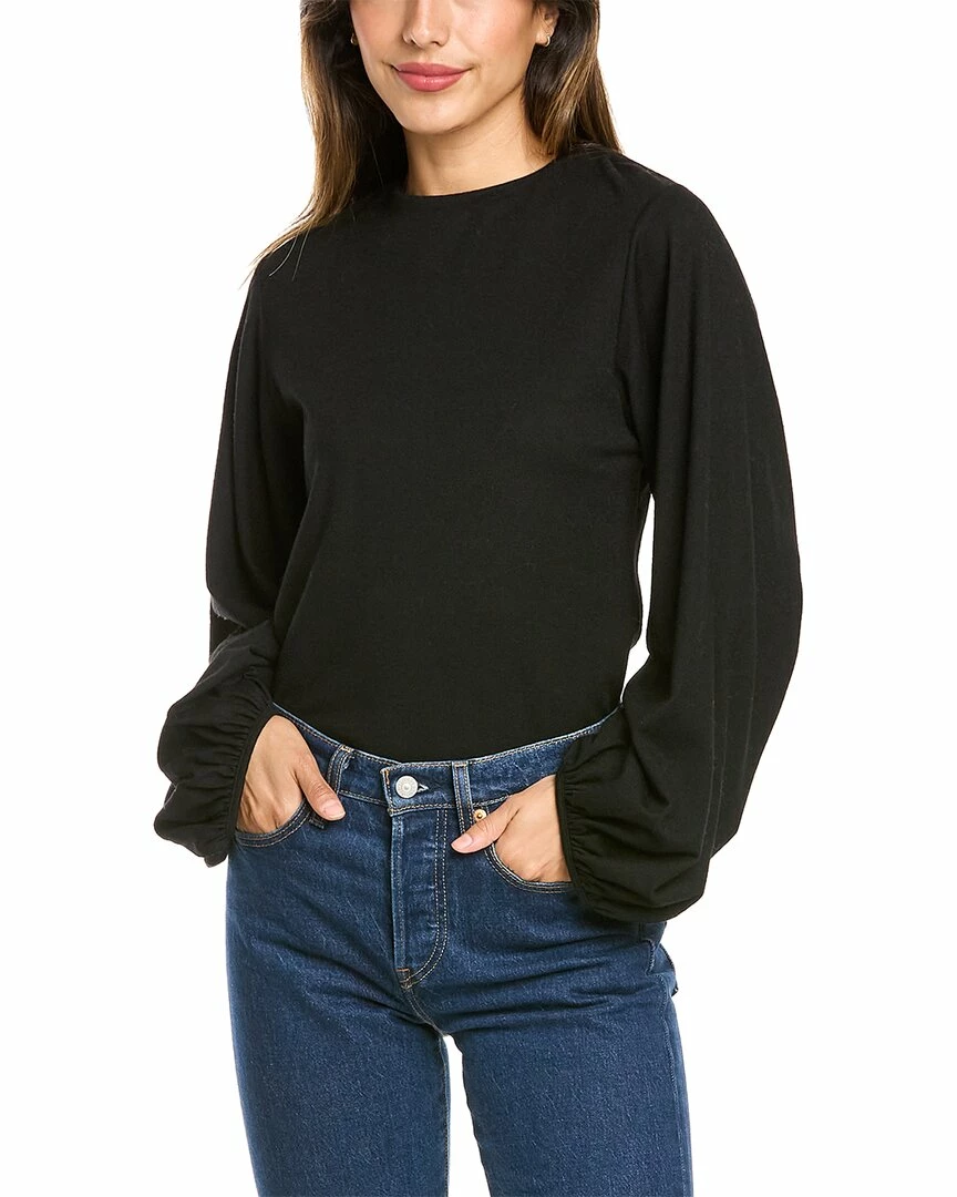 - Puff Sleeve Wool-Blend Top in black with crewneck and ruched puff sleeves