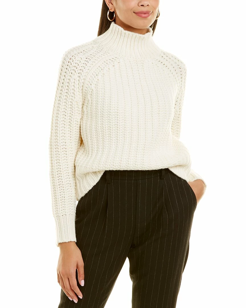 - Ribbed Turtleneck Wool & Cashmere-Blend Sweater in cream with chunky knit, turtleneck, and cropped hem