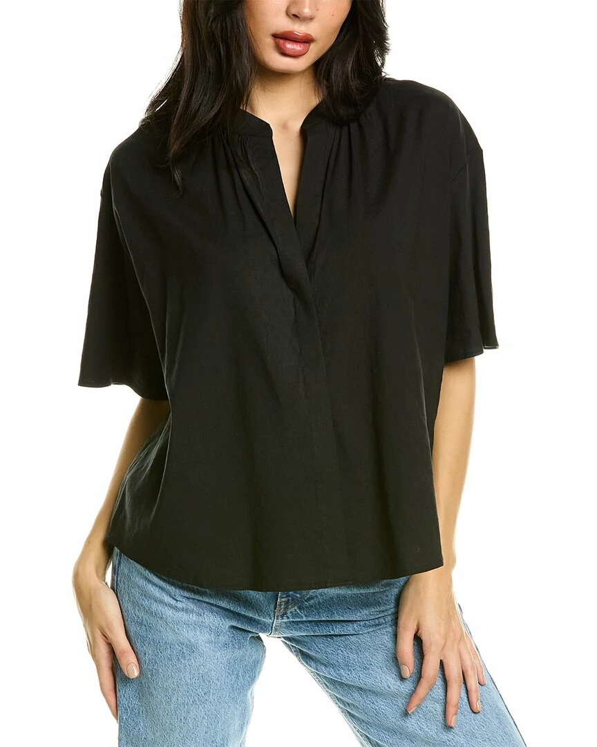 Vince Shirred Band Collar Linen-Blend Top Women Tops