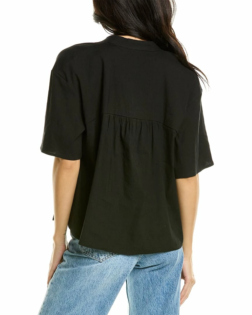 - Shirred Band Collar Linen-Blend Top in black with boxy silhouette and dropped-shoulders