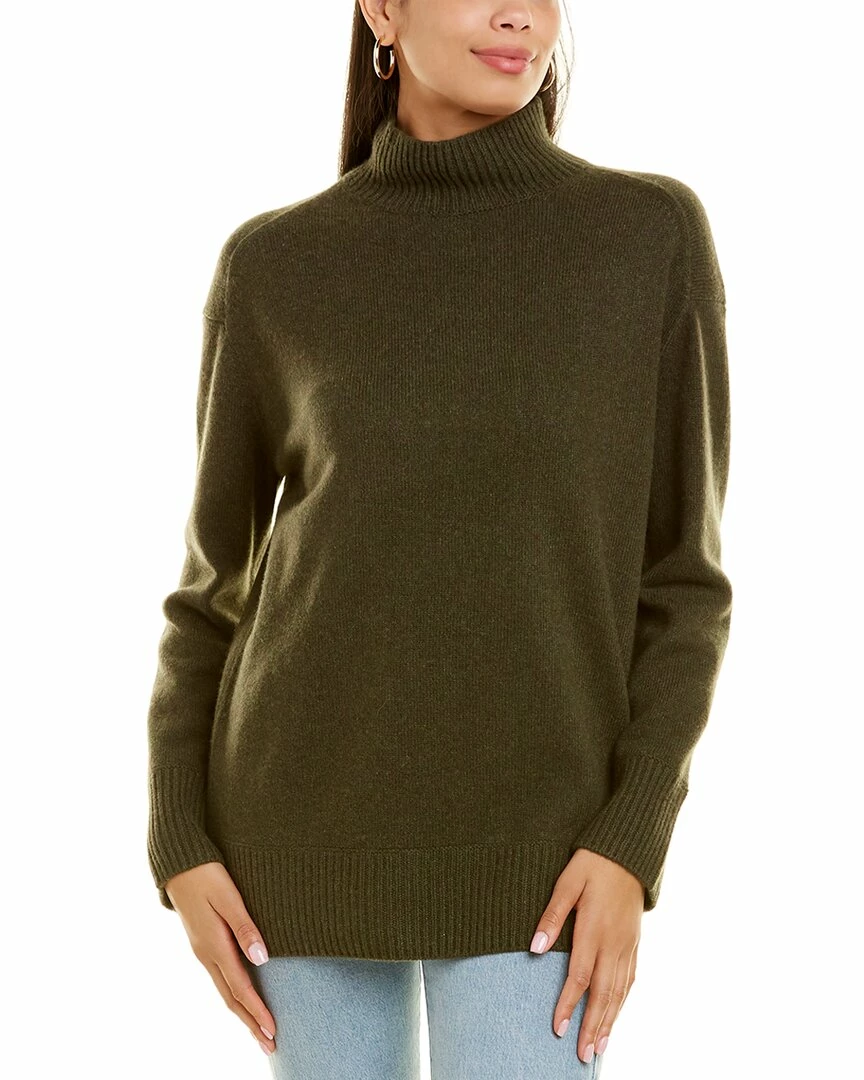 - Side Slit Turtleneck Cashmere Sweater in dark pine with turtleneck, dropped-shoulder sleeves, ribbed trim, and side slits at hem