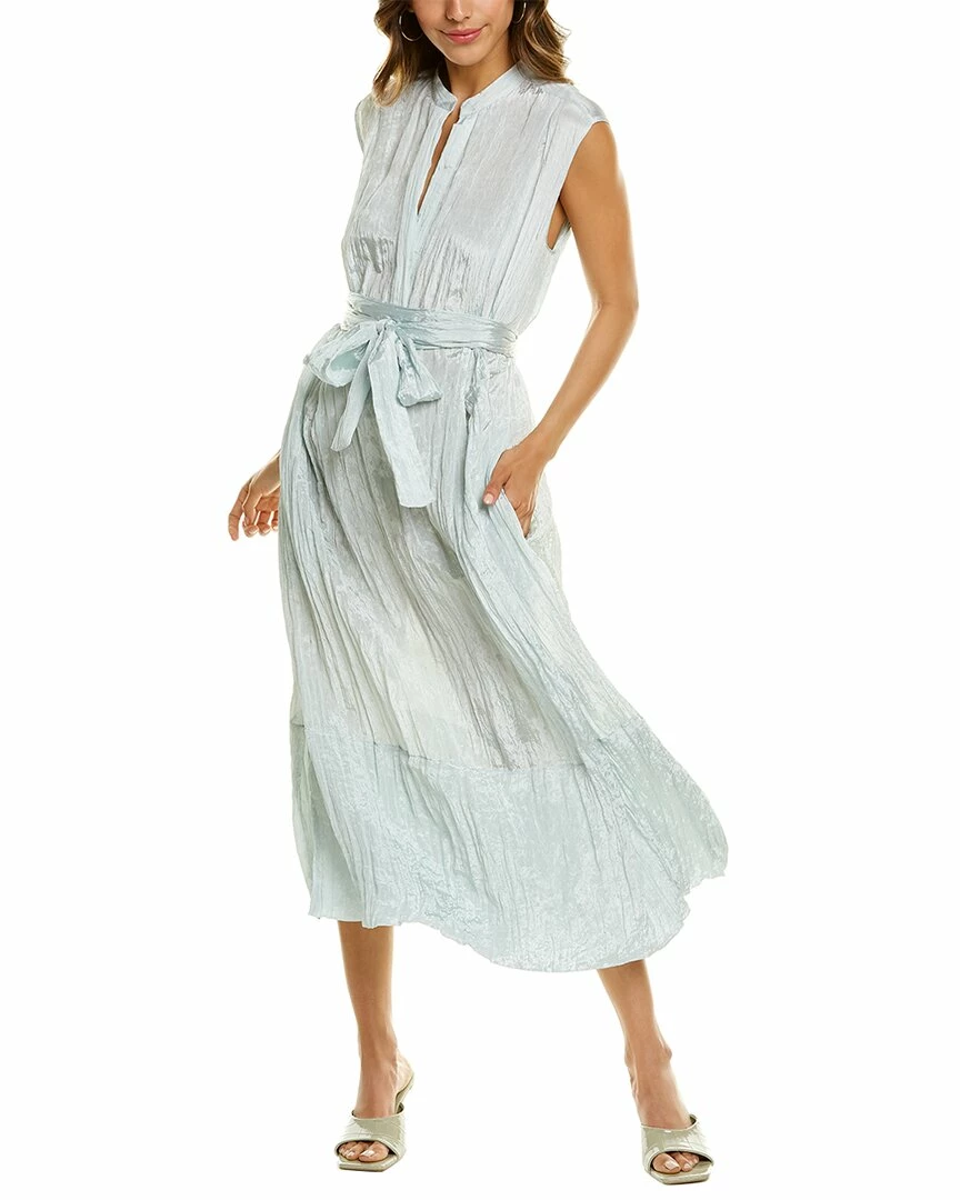 - Textured Popover Dress in mint with crinkle textured design, mock collar, V-neck, side slits at seams, and self-tie sash at waist